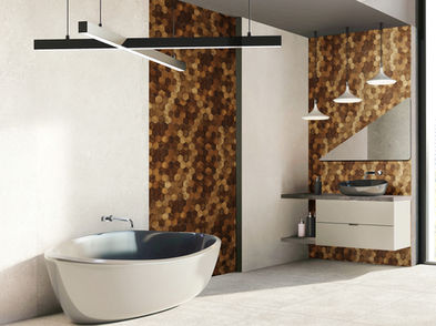 Currently available in 20 patterns, Forest Elements Wood Mosaic Wall Tiles provide a durable, yet lightweight design option for full walls, accent walls, bar fronts, wainscots, and everything in between.